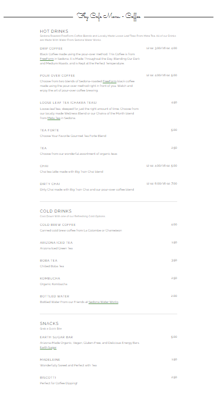 The menu features a selection of beverages and light snacks designed for coffee breaks and casual visits. Visitors can choose from a variety of cold drinks, including iced coffee available in light, medium, dark, or decaf roasts, as well as iced chai tea and organic kombucha options. Bottled water is also offered.